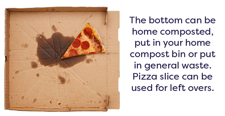 Contaminated pizza boxes can also be processed in a home composting system – tearing it up will help it break down faster.